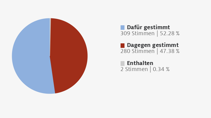 28.10.2010Entwurf eines Elften Gesetzes zur Änderung des AtomgesetzesGesetzentwurf der Fraktionen der CDU/CSU und FDP über den Entwurf eines Elften Gesetzes zur Änderung des Atomgesetzes - Drs. 17/3051, 17/3409 und 17/3453GesamtDafür 309 Stimmen | 52.28 Dagegen 280 Stimmen | 47.38 Enthalten 2 Stimmen | 0.34 CDU/CSUDafür 225 Stimmen | 96.98 Dagegen 5 Stimmen | 2.16 Enthalten 2 Stimmen | 0.86 CDUDafür 184 Stimmen | 96.84 Dagegen 4 Stimmen | 2.11 Enthalten 2 Stimmen | 1.05 CSUDafür 41 Stimmen | 97.62 Dagegen 1 Stimmen | 2.38 Enthalten 0 Stimmen | 0 SPDDafür 0 Stimmen | 0 Dagegen 137 Stimmen | 100 Enthalten 0 Stimmen | 0 FDPDafür 84 Stimmen | 96.55 Dagegen 3 Stimmen | 3.45 Enthalten 0 Stimmen | 0 GRÃNEDafür 0 Stimmen | 0 Dagegen 67 Stimmen | 100 Enthalten 0 Stimmen | 0 DIE LINKE.Dafür 0 Stimmen | 0 Dagegen 68 Stimmen | 100 Enthalten 0 Stimmen | 0 Inhalte laden...