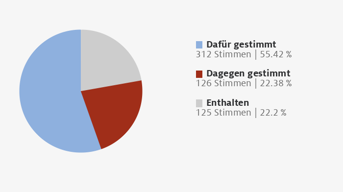 28.02.2013Holzhandel-SicherungsgesetzÄnderung des Holzhandels-Sicherungs-GesetzesGesetzentwurf der BundesregierungErstes Gesetz zur Änderung des Holzhandels-Sicherungs-Gesetzes- Drucksachen 17/12033 und 17/12400 -GesamtDafür 312 Stimmen | 55.42 Dagegen 126 Stimmen | 22.38 Enthalten 125 Stimmen | 22.2 CDU/CSUDafür 227 Stimmen | 100 Dagegen 0 Stimmen | 0 Enthalten 0 Stimmen | 0 CDUDafür 188 Stimmen | 100 Dagegen 0 Stimmen | 0 Enthalten 0 Stimmen | 0 CSUDafür 39 Stimmen | 100 Dagegen 0 Stimmen | 0 Enthalten 0 Stimmen | 0 SPDDafür 0 Stimmen | 0 Dagegen 126 Stimmen | 100 Enthalten 0 Stimmen | 0 FDPDafür 85 Stimmen | 100 Dagegen 0 Stimmen | 0 Enthalten 0 Stimmen | 0 GRÃNEDafür 0 Stimmen | 0 Dagegen 0 Stimmen | 0 Enthalten 61 Stimmen | 100 DIE LINKE.Dafür 0 Stimmen | 0 Dagegen 0 Stimmen | 0 Enthalten 63 Stimmen | 100 fraktionslosDafür 0 Stimmen | 0 Dagegen 0 Stimmen | 0 Enthalten 1 Stimmen | 100 Inhalte laden...